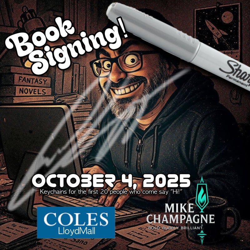 Hey all! My book signing is coming up October 4th and I'm getting excited! I've got a bunch more books to add to my collection. A little something for fantasy. A little for sci-fi. A bunch for comedy. And I'm gonna have goodies too. I have keychains for the first 20 people who come say hi.